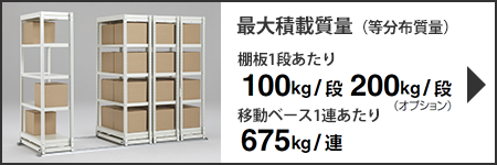 - 棚板1段あたり100kg/段、移動ベース1連あたり675kg/連
