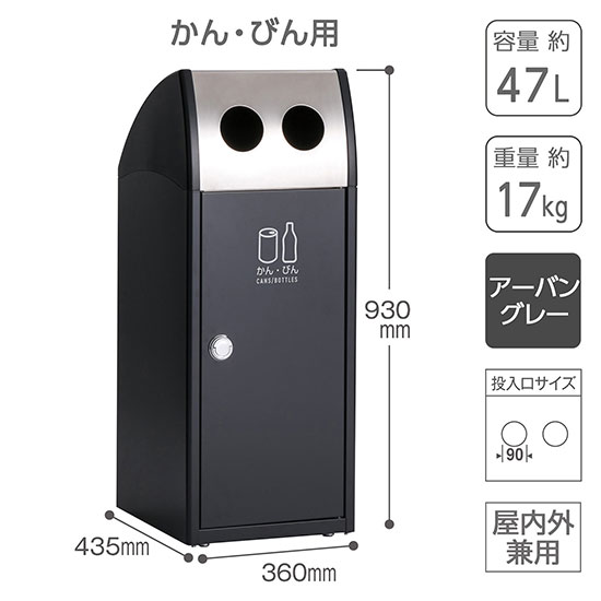 容量約47L、かん・びん用の分別ラベル付き屋外用ダストボックス。投入口はステンレス製、本体はアーバングレー色のスチール製です。