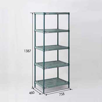 棚板だけでなく、支柱から構造すべてが樹脂製のシェルフシリーズです。さらに棚あたりの耐荷重量を確保したラインナップです。