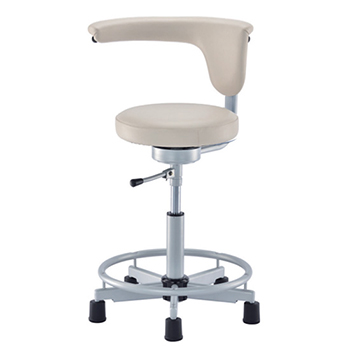 CM116AW-VNVは、背もたれが作業時の腕置きになる、東洋工芸のデンタルチェア固定脚です。フレーム色はアイボリー。背座面の張地はネイビーレザーです。