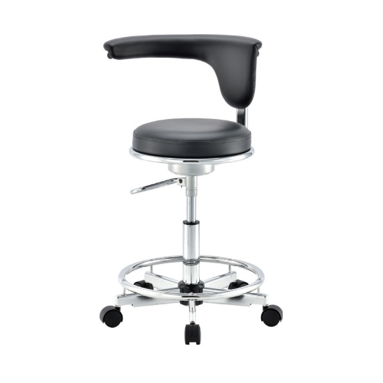 CM-107-VBKは、背もたれが作業時の腕置きになる、東洋工芸の脚掛リング付デンタルチェアです。衣類が引っ掛かりにくい丸型昇降レバー採用。ナイロン双輪キャスター、フレーム色はクロームメッキ、背座面の張地はブラックレザーです。