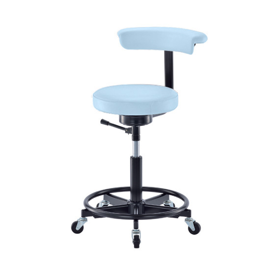 CM127GT-VBLは、T字型背もたれが作業時の腕置きになる、東洋工芸のデンタルチェアで足掛けリング付きゴム単輪キャスターです。ブラックフレームで背座面の張地はブルーレザーです。