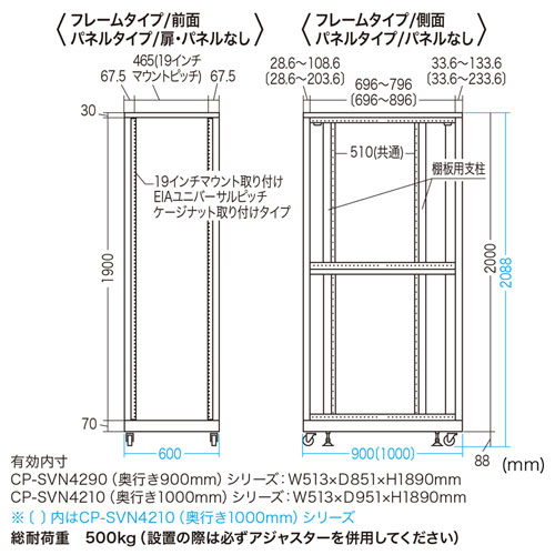 CP-SVN4210NPBKNは組立式19インチサーバーラックパネルなし仕様です。ユニット数42U、奥行1000mm、カラーはブラックです。