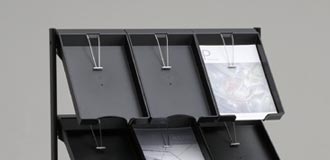 L959XD-Z25は、1区画ずつ取り外せるカセットタイプのパンフレットスタンドです。A4判10段1列。用紙押さえにより、残り枚図が少なくなっても腰折れせずに取り出しやすい状態を保ちます。