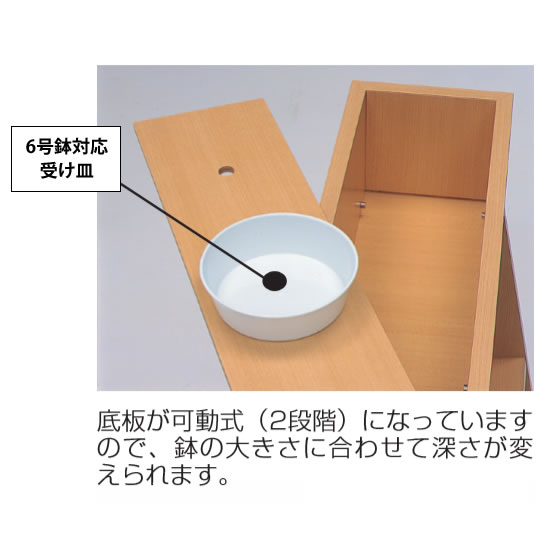 プランターボックスとシェルフ内寸法図。上部プランターBOXには6号鉢用の受け皿が付属している。