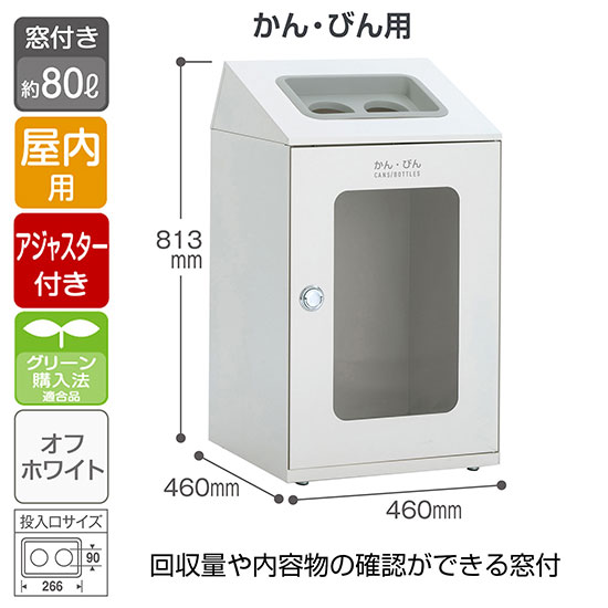 屋内用のスチール製屑入、かん・びん用。容量は約67L、市販の70L用ポリ袋に対応します。中身が見える窓付扉タイプ。カラーはオフホワイト。