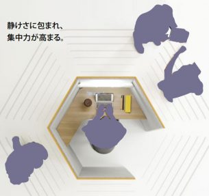 オープンな場所から離れて、一人で集中したい時に最適。外側の音を遮り、 内側の音を漏れにくくする吸音性の高いパネルがあなたを包み込みます。