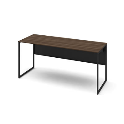 厚さ15mmの薄い天板と細いブラック色のフレーム脚が特徴の、圧迫感のないオフィスデスク。1800×700mmの平机(角形)、PWダーク天板。