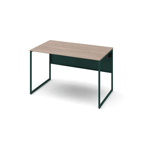 厚さ15mmの薄い天板と細いダークグリーン色のフレーム脚が特徴の、圧迫感のないオフィスデスク。1200×700mmの平机(角形)、チョークドエルム天板。