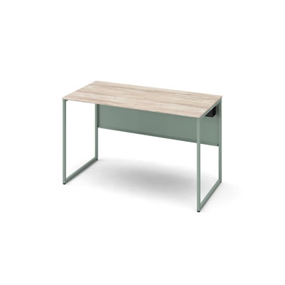 厚さ15mmの薄い天板と細いダークグリーン色のフレーム脚が特徴の、圧迫感のないオフィスデスク。1600×600mmの平机(角形)、ビンテージエルム天板。