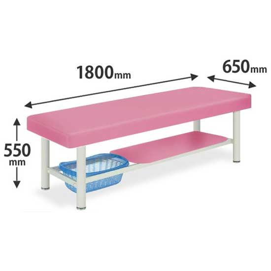 NTB-SD8-6555-PKは、張地カラーピンクの診察台です。安定性を重視した形状で、シート下に棚と脱衣カゴ付き。長さ1800mm×幅650mm×高さ550mm、耐アルコール・耐次亜塩素酸ビニールレザー張り。
