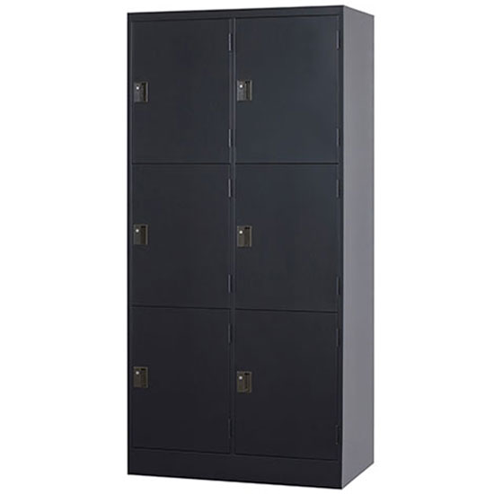 TLK-NC6S-MBは2列3段の6人用、錠前交換ができる内筒交換錠。全面ブラック塗装のスチールロッカーです。