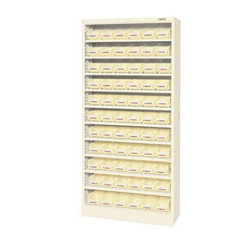 SCR-09CREはレッドコンテナを備えたラックケースです。付属の引き出しは3列5段、本体はホワイトグレーです。