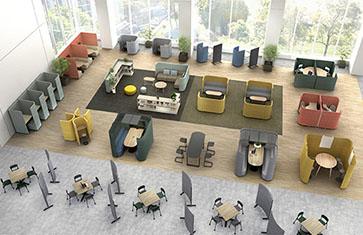 豊富なパネルと各種専用パーツを組み合わせて、ユニット型のソロブースやミーティングブースはもちろん、オリジナルのワークブースを作成できます。マッフル以外のテーブルやシェルフとも組み合わせても使え、オフィス全体へ自由に配置可能です。