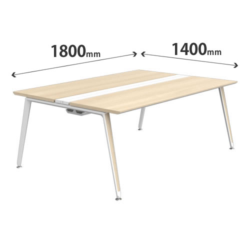 プリシードシリーズの自立型デスク。単体でも、増連型と組み合わせても使えます。天板サイズは1800×1400mm、カラーは天板:プライズウッドライト、脚部:ネオホワイト。
