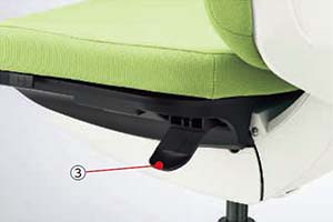 ④座面奥行調節:座面左下(前方)のレバー操作により、座面の奥行きが調節できます。(前後50mm、6ポジション)