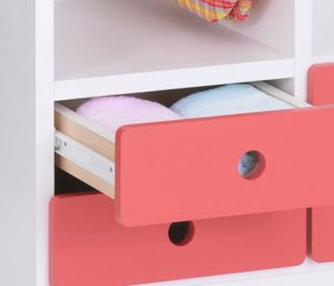 カドと持ち手が丸く作られた、ケガをふせぎ幼児にも引き出しやすい形状の引出し。レール式で開閉も滑らかです。全て閉めても隣り合う引き出しとの間にスキマがあるので、指詰めなどの危険も軽減されます。
