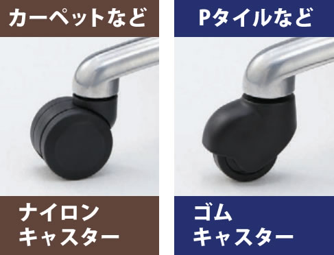 オフィスによくあるカーペットなどの柔らかい床ならナイロンキャスター、タイル張りなどの固く滑りやすい床にはゴムキャスタータイプをお選びください。