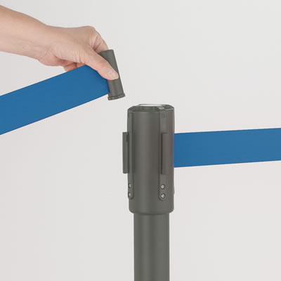 ブラックのポール本体にベルトカラーが青のベルトパーテーションです。脚部はスタッキングタイプなので、省スペースでの収納が可能です。