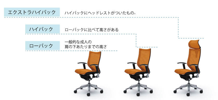オフィスチェアを選ぶ際に最初に選択をする部分がハイバックとローバックの部分であることが多いと思います。 使用する人の体格に大きく関わり、個人差が大きいためきちんと吟味して選ぶことが大切です。
