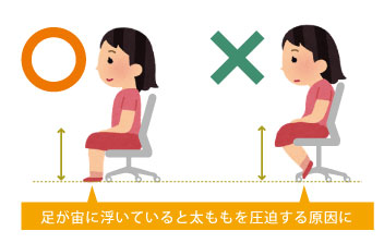 ![]() | 脚のむくみの原因は座面の高さが一因体格に合わないオフィスチェアを使用すると肩や腰などの不快な症状に悩まされることがあります。中でも特に女性に多いのは脚のむくみではないでしょうか。 脚のむくみの原因とされているのが太ももの圧迫です。足裏が地面につかずにぶらぶらと宙に浮いたり、座面の下でクロスした状態になっていたりすると太ももの血液の循環を妨げることになりむくみにつながります。 腰を座面奥まで付けた状態でひざを垂直に曲げ、足裏が地面についているのが理想形。どうしても届かない場合はフットレストの使用もおすすめです。 |