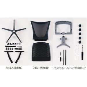 各部材は簡単に分離解体が可能です。樹脂部分には原材料名を表示しています。再生したポリアミドを使用した部品をパーツの一部に使用しており、座クッションタイプの張地も51%以上再生材使用の布地のためグリーン購入法に適合しています。