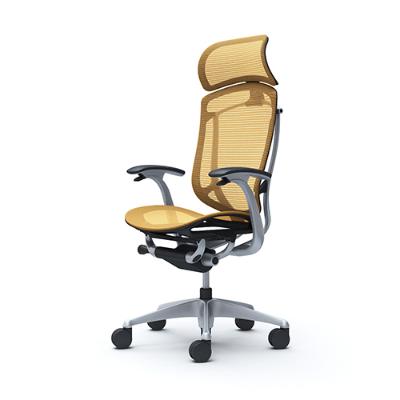 進化した最高級ビジネスチェアコンテッサセコンダ。フレームはシルバーのボディカラーはブラック。背面エクストラハイバックの座面メッシュ、カラーはイエロー。