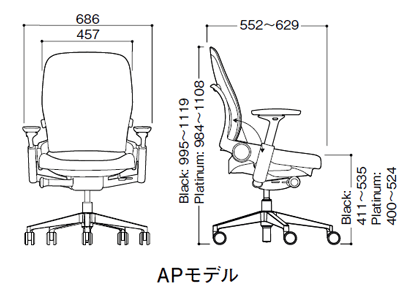 - サイズ: 幅686×奥行552~629×高さ995~1119(座高411~535)mm