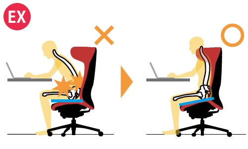 普通の椅子で前かがみになる姿勢と比較して、前傾姿勢用のチェアではおなかの圧迫が解消。骨盤が起きて背骨のS字も保たれ、腰の負担も軽減されます。
