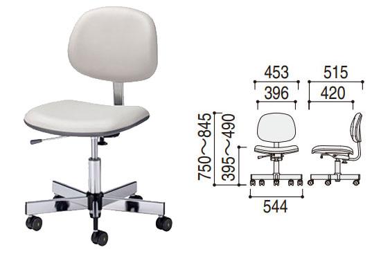 - 導電性ビニールレザー張り(耐次亜塩素酸機能付き)、座面回転・チルト機構、ウレタンフォームクッション