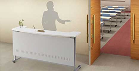 コミュニケーションを促進する、双方向からアクセスしやすいライブスシリーズのカウンター。幅1800型の片エンド用、カラーは天板:ホワイト、本体:プライズウッドミディアム。