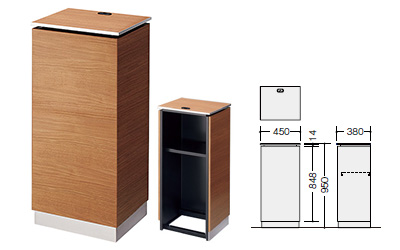 天板幅450mm×奥行380mm、カラーは天板・本体共にミディアムウォールナットのインフォメーションカウンターです。配線口・中棚付き。