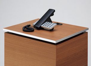 天板幅450mm×奥行380mm、カラーは天板・本体共にシルクウッドのインフォメーションカウンターです。配線口・中棚付き。