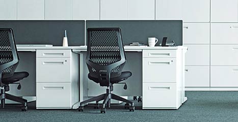 3420CC-MKR1はオカムラ昇降デスク・スイフトの進化版、スイフトネックスです。本体はホワイトのスタンダード昇降。天板はスクエアエッジで幅1450奥行775のライトグレージュです。