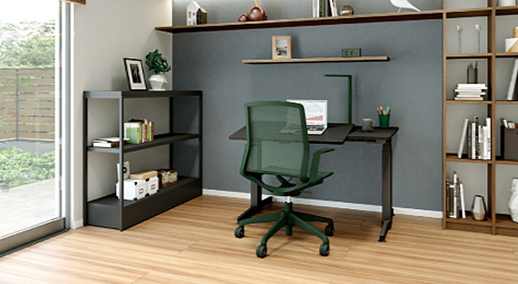 3420CD-MKS3はオカムラ昇降デスク・スイフトの進化版、スイフトネックスです。本体はブラックのスタンダード昇降。天板はスクエアエッジで幅1350奥行775のダークグレーです。