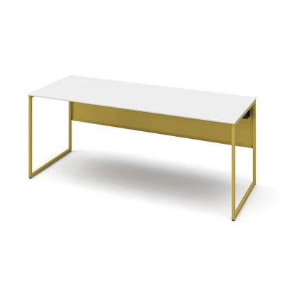 厚さ15mmの薄い天板と細いイエロー色のフレーム脚が特徴の、圧迫感のないオフィスデスク。1800×450mmの平机(角形)、ホワイト天板。