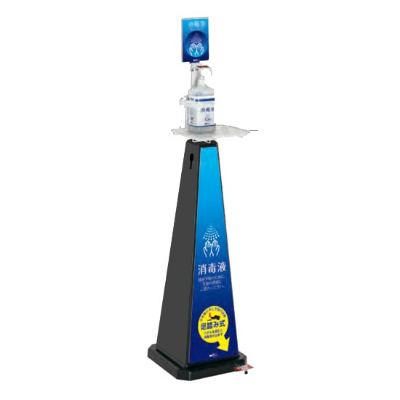 ブラックの本体にブルーラベル、高さ1140mm。ミセルシリーズの足踏み式アルコールスタンドです。
