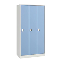 清潔感のあるホワイト色。3列5段・15人用の区画に分かれた、100円硬貨で施錠するリターン式コインロッカーです。