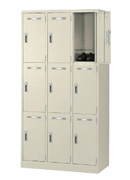3列3段9人用のシリンダー錠タイプロッカーです。ニューグレー色のシンプルな国内生産のスチールロッカーになります。お見積になりますが別色もご用意しております。