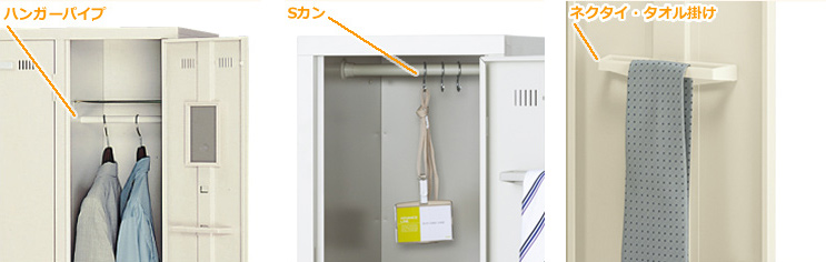 扉の裏側にはネクタイ・タオル掛けも付属しているため、ロッカー内が整理整頓しやすい構造になっています。