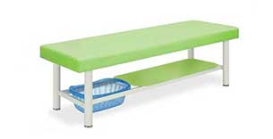 NTB-SD8-6050-GNは、張地カラーライムグリーンの診察台です。安定性を重視した形状で、シート下に棚と脱衣カゴ付き。長さ1800mm×幅600mm×高さ500mm、耐アルコール・耐次亜塩素酸ビニールレザー張り。
