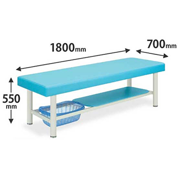 NTB-SD8-6055-BLは、張地カラースカイブルーの診察台です。安定性を重視した形状で、シート下に棚と脱衣カゴ付き。長さ1800mm×幅600mm×高さ550mm、耐アルコール・耐次亜塩素酸ビニールレザー張り。