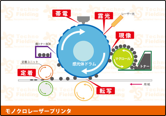 仕組みとしてはレーザー光を感光体に照射し、静電気で用紙にトナーを付着させ画像を形成、プリンタ内蔵の定着器(フューザーユニット)で熱と圧力を加え、用紙に定着させることで印刷されています。