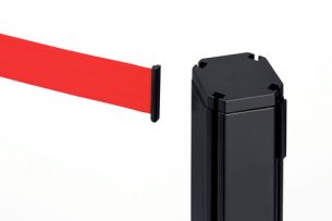スクエア型ベースですっきりした印象の、ブラックカラーのベルトパーテーション。高さ1m・ベルト長2.5m、ベルトカラーは視認性の高いレッドです。