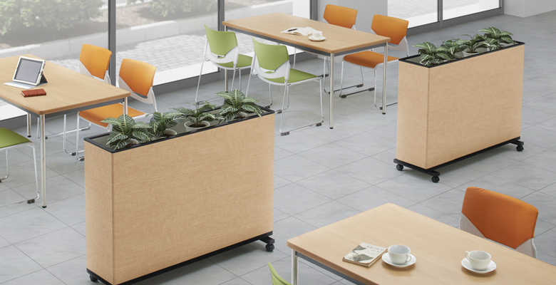 GR2013は、株式会社ベルクが手がける、シンプルスタイルのグリーンカーテンタイプ・パーテーションで高さがロータイプ1300mmです。木目シート仕上げの本体フレームが、空間にやさしいナチュラルな印象を与えます。