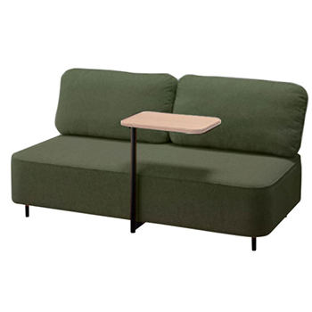 RC2012SLFB-DGR-MWは、ナイキ製オフィスソファー「ナイキ フィナンシェ」シリーズの2人掛けソファです。張地はダークグリーンの布張り。左肘付き、ミディアムウォールナット色天板の可動テーブル付きです。