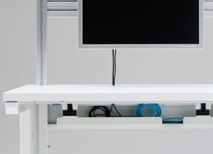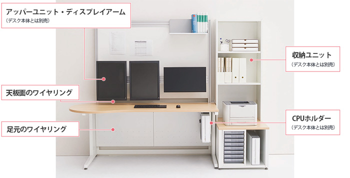 ディスプレイアームを用いてモニターをアッパーユニットに設置することで、災害時のモニター転倒を防ぎます。また、机上面を有効活用でき、天板を拭きやすくなるため清潔に保つことができます。