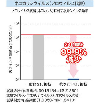 また、0.02%次亜塩素酸ナトリウムで拭き掃除をしても抗ウイルス性能の低下はなく、メラミン化粧板の表面が劣化することもありません。