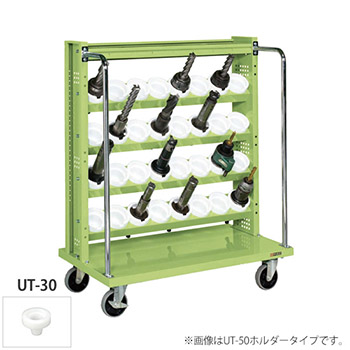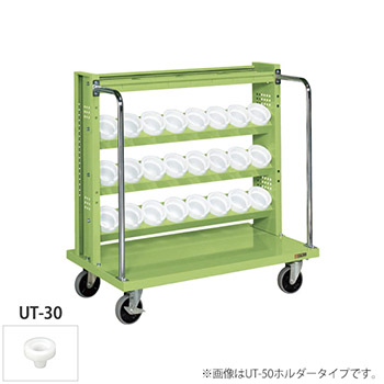 幅1030mmの3段+最上段トレー付きツーリングワゴン。ホルダーはUT-30型、キャスターは四輪自在。本体カラーはグリーン。