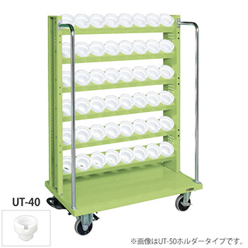 幅1030mmの5段+最上段トレー付きツーリングワゴン。ホルダーはUT-40型、キャスターは四輪自在。本体カラーはグリーン。
